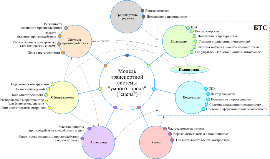 Компьютерная модель транспортной системы «умного города» с системами обнаружения, локализации и противодействия беспилотным транспортным средствам состоит из основного объекта транспортной системы «умного города» («сцены»), в котором размещаются все остальные модели объектов. Через «сцену» осуществляется взаимодействие различных объектов друг с другом. Компьютерная модель может быть построена с использованием агентно-ориентированного подхода совместно с подходом автоматного программирования, поскольку предполагается, что все агенты в модели имеют конечное число возможных состояний.